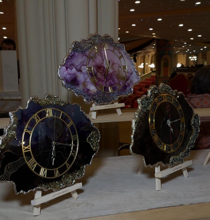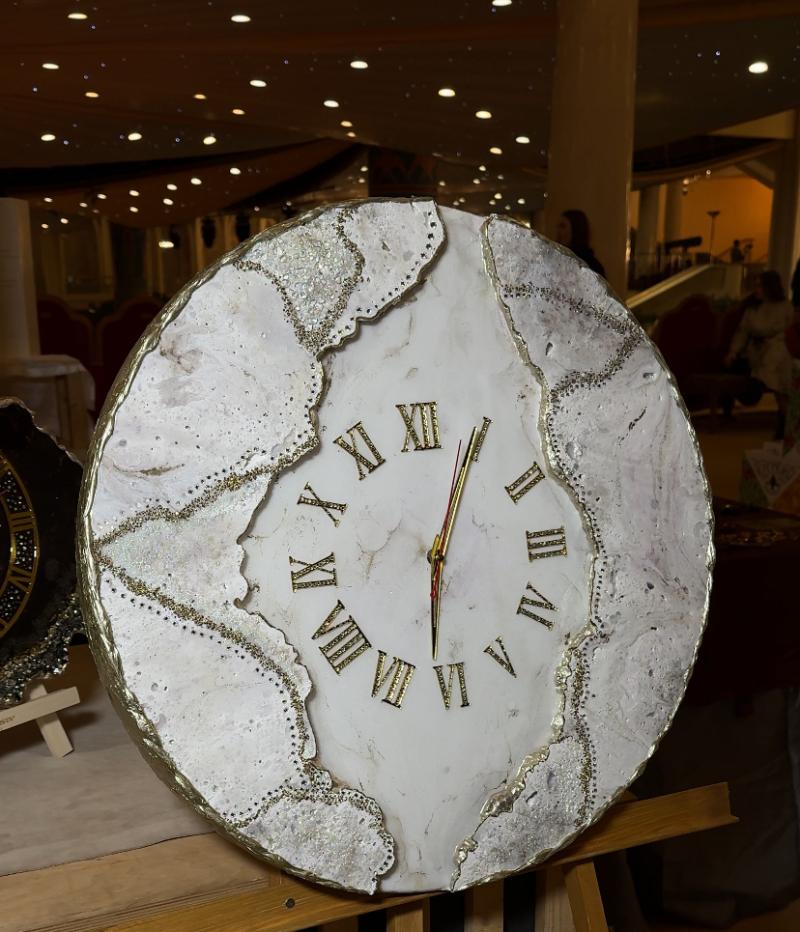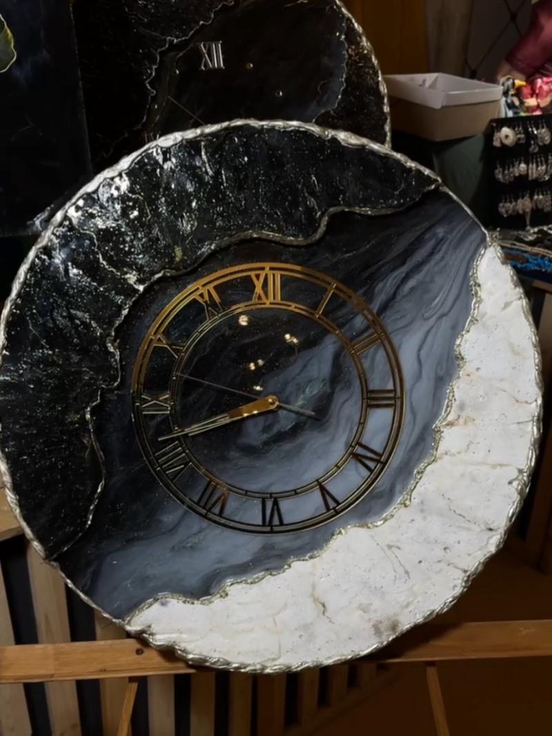 Дизайнерские интерьерные часы ручной работы Эксклюзивные двухуровневые интерьерные часы (диаметр 80) из эпоксидной смолы ручной работы. В работе использованы: Акриловый грунт, Акриловые краски, жидкая поталь, инкрустация стразы, горный хрусталь, пигменты, ювелирная эпоксидная смола . Год изготовления 2025